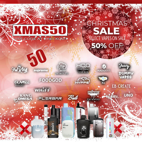 CHRISTMAS MEGA SALE - SELECT VAPES ONLY enter discount code XMAS50 at check out to receive your discount.